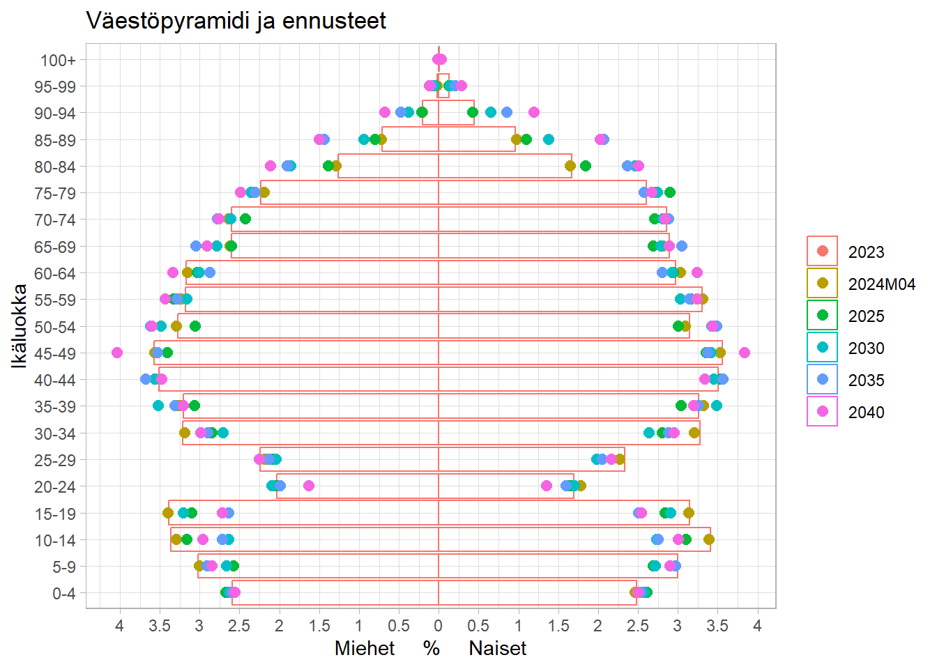 13.2 Väestöpyramidi nykytilanteella ja Tilastokeskuksen ennustevuosina